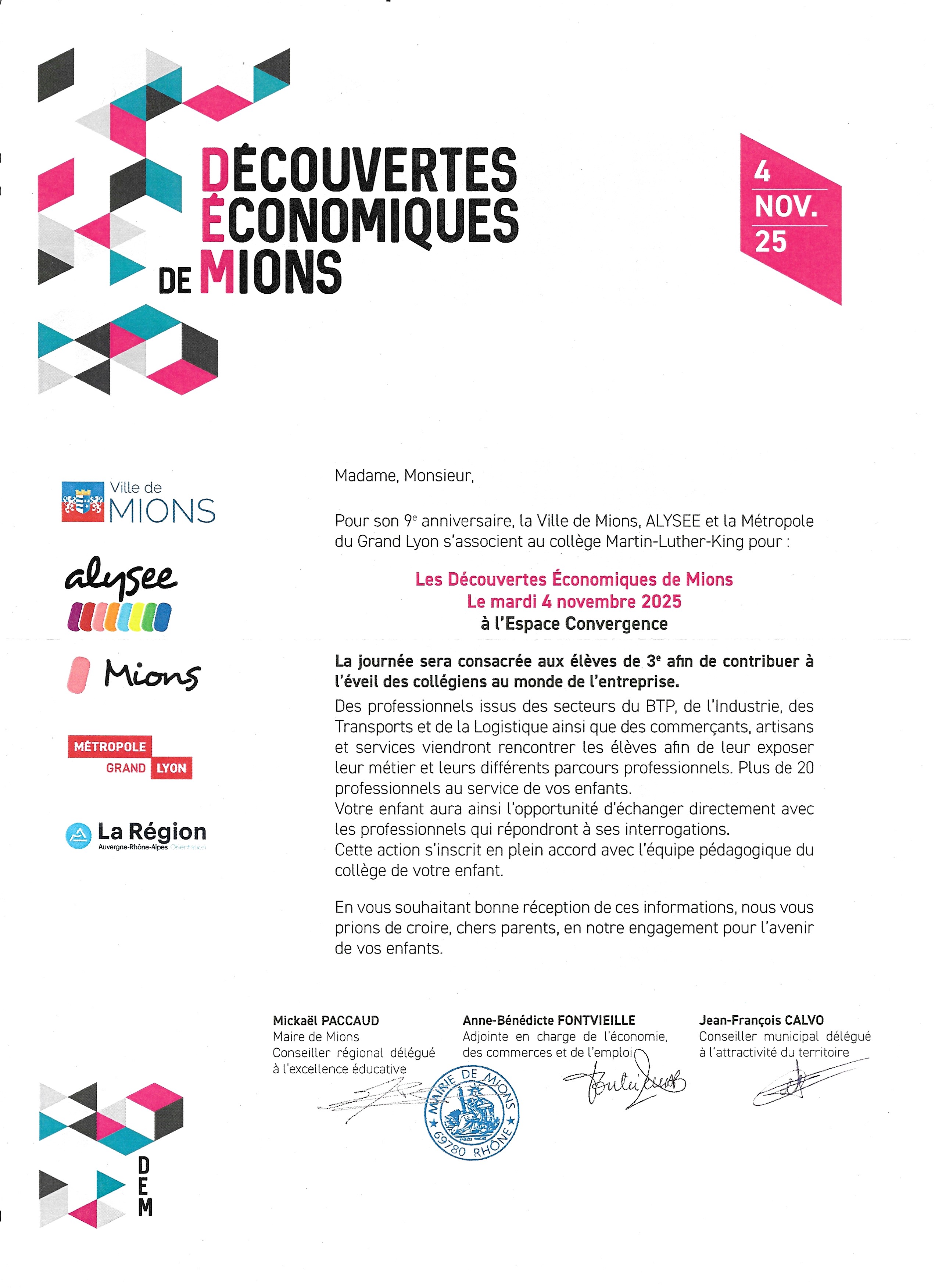Les DEM (Découvertes Économiques de Mions) ont lieu cette année avec les élèves de 3ème du collège Martin Luther King, le mardi 4 novembre 2025.